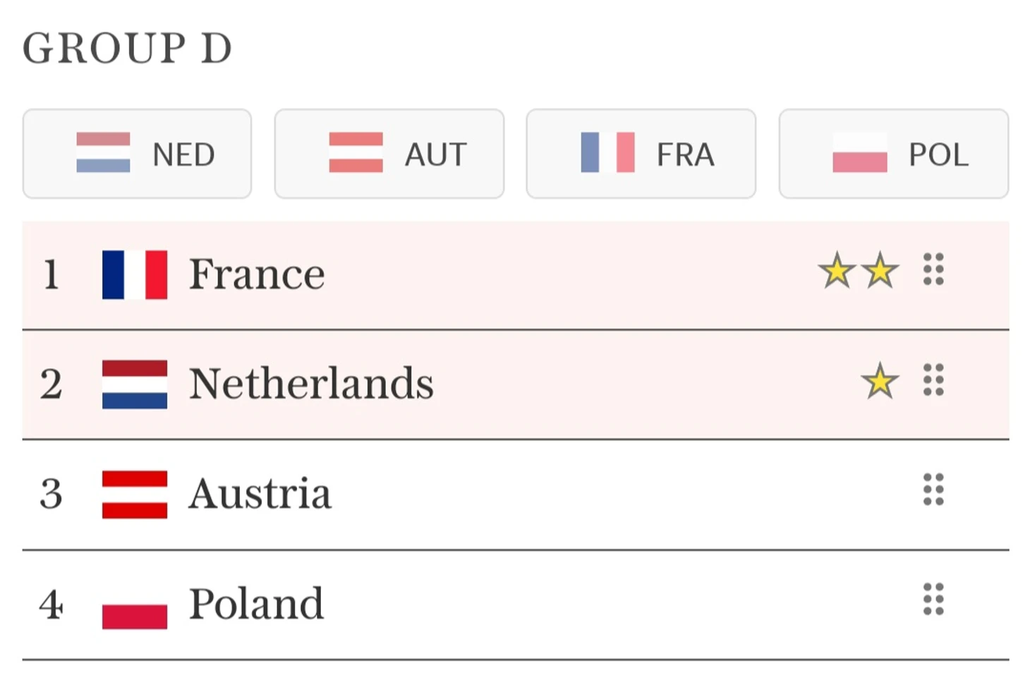 Группа D - одна из самых интересных и трудных для прогнозов группа. Здесь сосредоточены 4 крепкие команды Европы, с которыми никому не в радость играть, но вот 2 команды из них - гранды. Франция Дидье Дешама с, наверное, лучшим составам в турнире, Польша, играющая неплохо при новом коуче Пробеже, Австрия Рангника и Нидерланды с крутой молодёжью. Погнали!