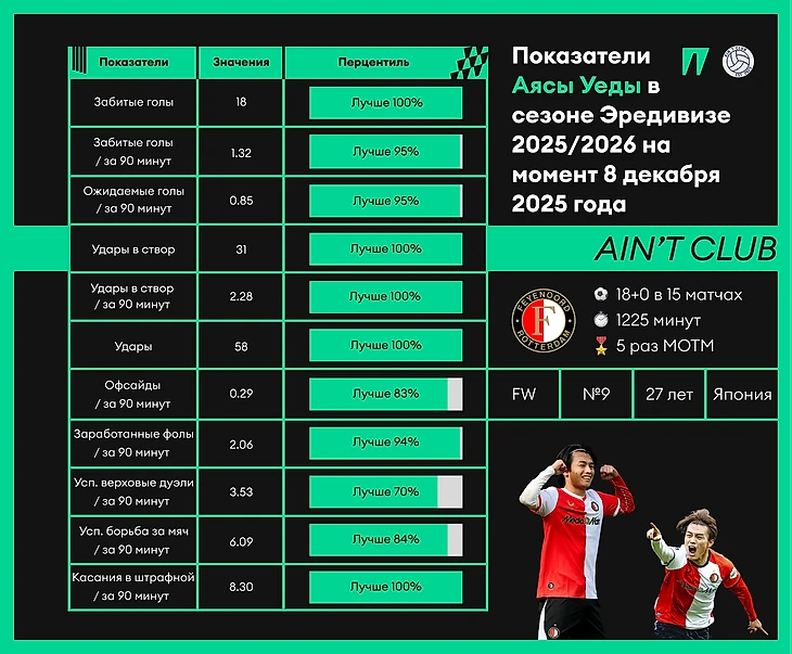 Наставничество Ван Перси и растущая уверенность все таки сделали свое дело. В сезоне 2025/26 стало ясно: при грамотном использовании Уэда — настоящий убийца в штрафной.