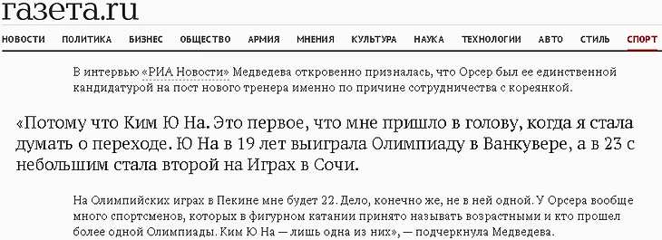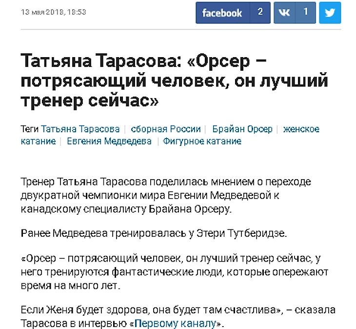 Зато активно Медведеву поддержала заслуженный тренер СССР, мастер спорта СССР международного класса Татьяна Тарасова. Видимо, к тому времени российским тренером она себя уже не считала, хотя и числилась тренером-консультантом сборной России по фигурному катанию.