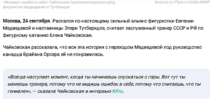 Не остался в стороне и мэтр отечественного фигурного катания Виктор Кудрявцев, который 17 августа 2019 г. корреспонденту издания «Спорт-Экспресс» Дмитрию Кузнецову, хотя и очень политкорректно, но, тем не менее, вполне определённо заявил, что в России есть специалисты, которые могли довести Медведеву до более высокого результата.