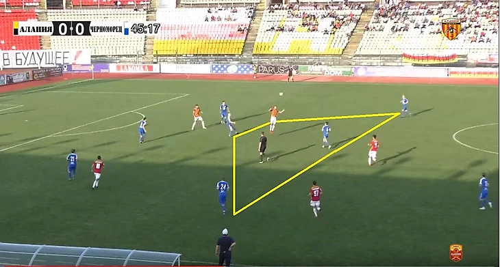 Так как «Черноморец» играл очень глубоко и практически не переходил центральную линию поля, за исключением нескольких контратак, то необходимость в третьем защитнике отпадала. К тому же ощущалась нехватка игроков в центральной оси поля и как следствие перемещения и коротких передач. В результате «Алания» располагается по схеме 4-2-3-1, которая немедленно приносит успех в виде ответного гола.