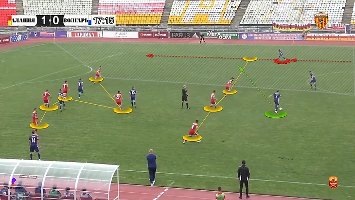3. Один из самых красивых моментов (я о передвижениях футболистов). Игроки за счет смены мест (скрещивание) введут в заблуждение "аланцев".