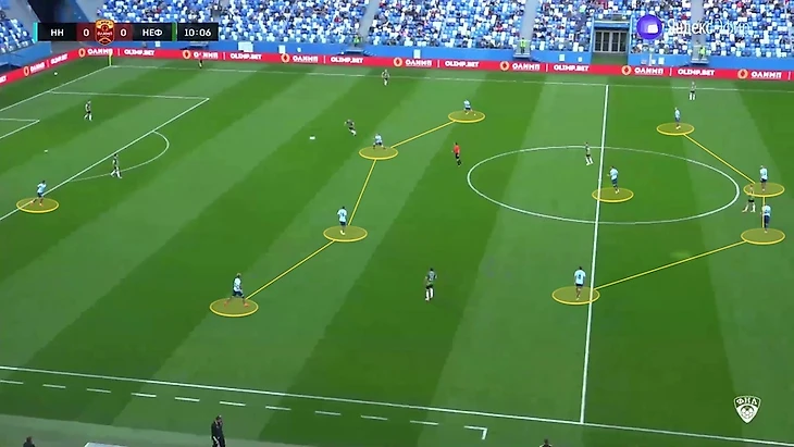 «НН» встречает соперника на его половине поля в модуле 4-1-4-1. В прошлом матче «Нефтехимик» сталкивался с трудностями при выходе из-под этого давления. После этого вратарь гостей все чаще стал выносить мяч длинной передачей вперед.