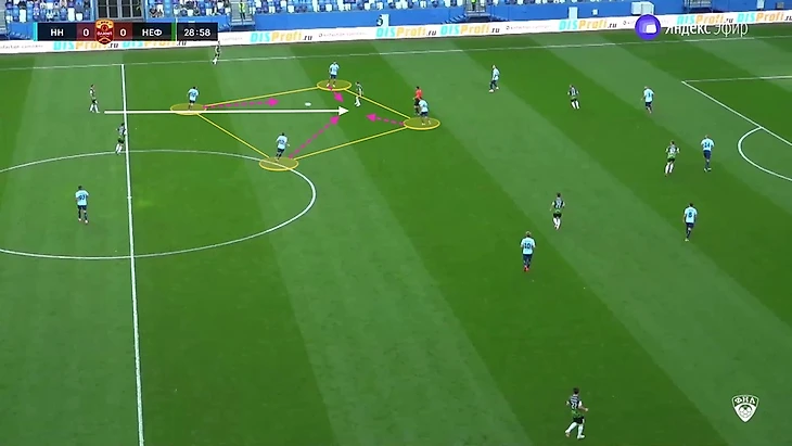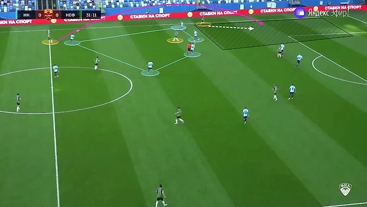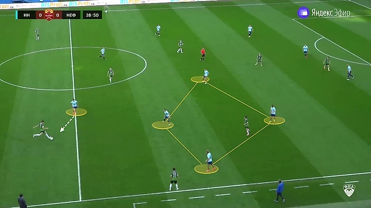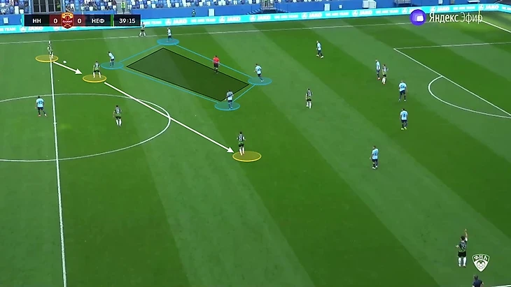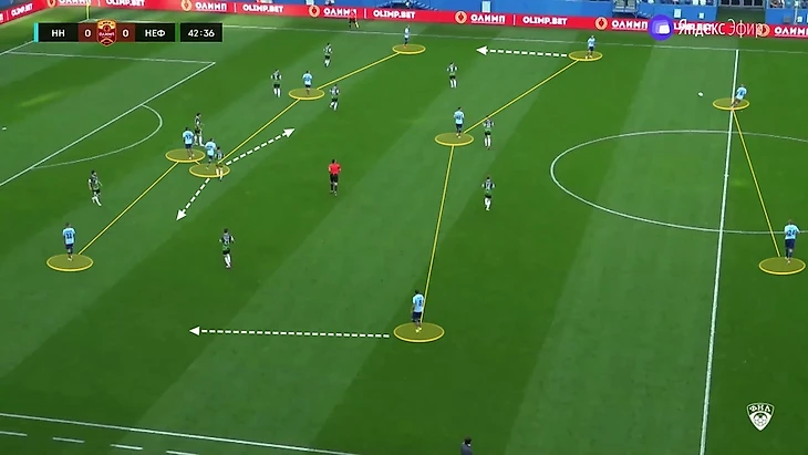 В среднем блоке команда обороняется организованно. Все футболисты отрабатывают на своих позициях и практически не выпадают из коллективного давления. А у «НН» он довольно специфичный и по-своему интересен. Команда смещается в сторону мяча, но не для того, чтобы помешать совершить передачу вперед, а для того, чтобы ограничить зону после передачи. Получаются своеобразные ловушки: