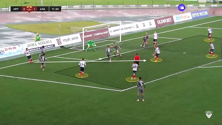 Необходимо быть внимательными на подборе после навесов в штрафную площадь. В этот момент практически у всех команд случаются трудности в обороне и «Алания» не исключение. Вот такие свободные зоны внутри штрафной и на подступах к ней появляются после стандартных положений.