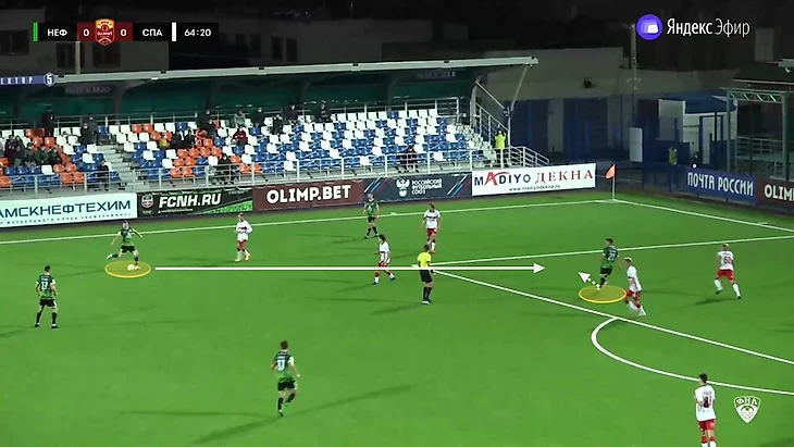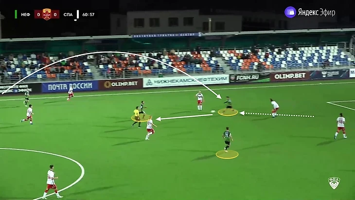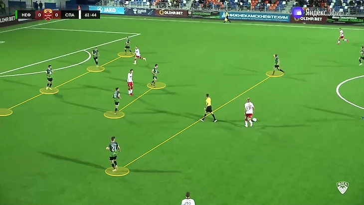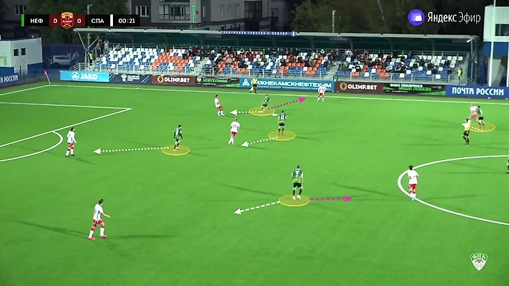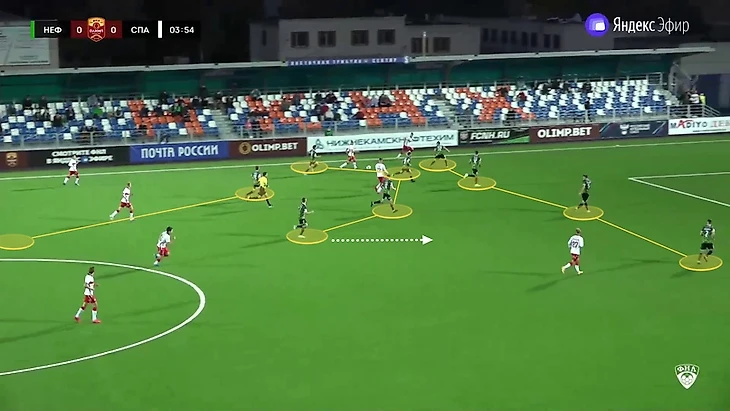 Если соперник все же решил развернуть атаку через фланг, то «Нефтехимик» создает компактность вокруг мяча. В эту зону смещаются оба центральных полузащитника, а на их место опускается вингер с противоположного фланга. Впереди остается один нападающий для быстрой ответной атаки.