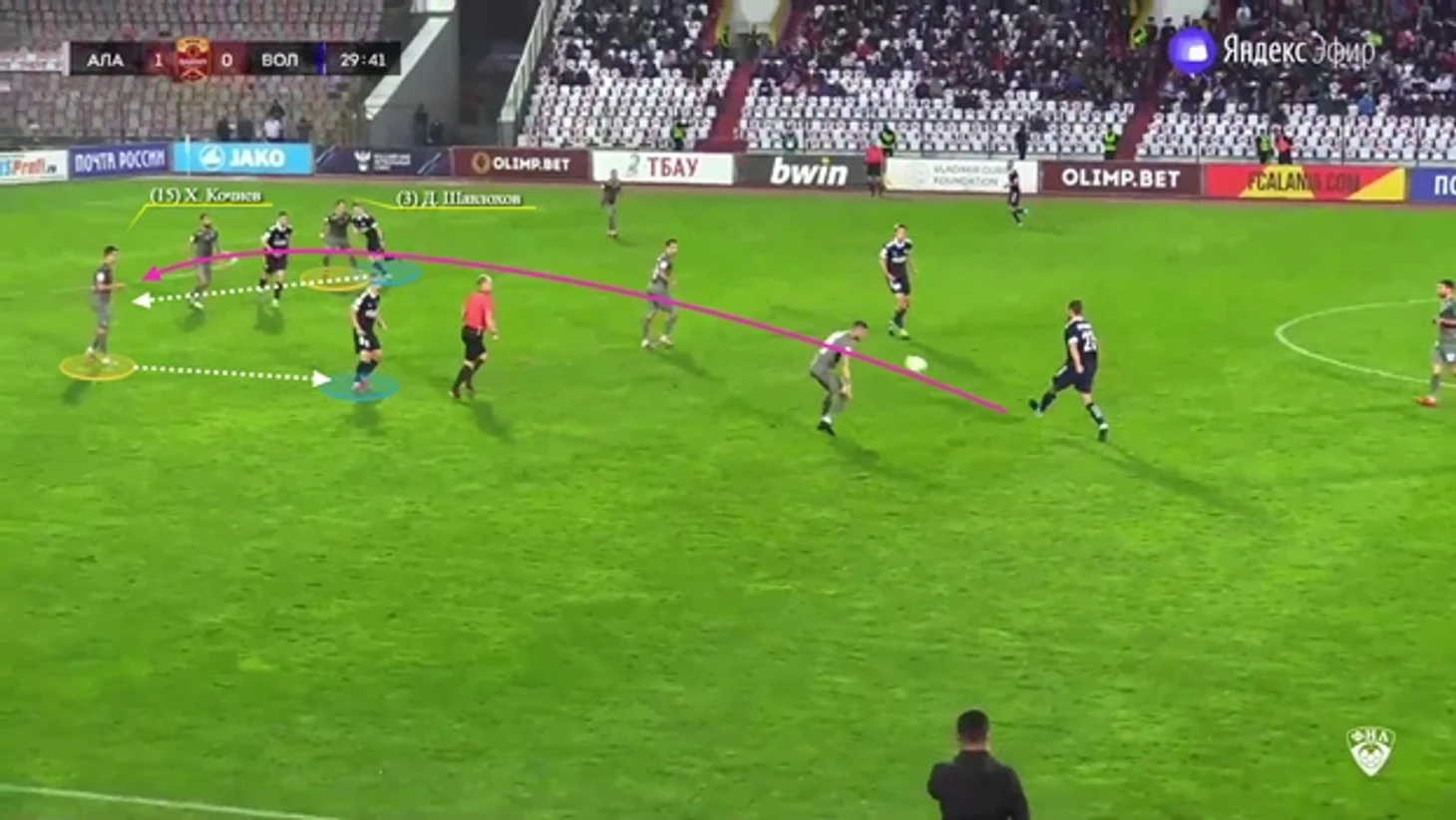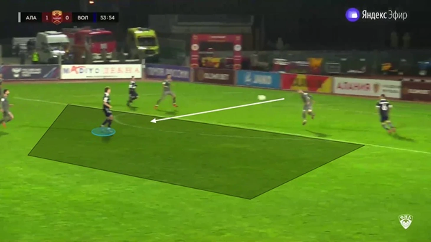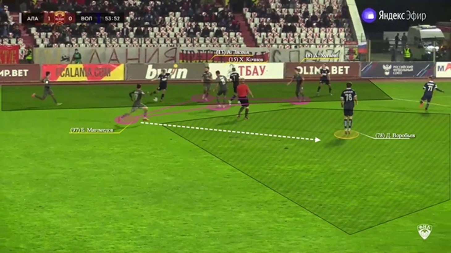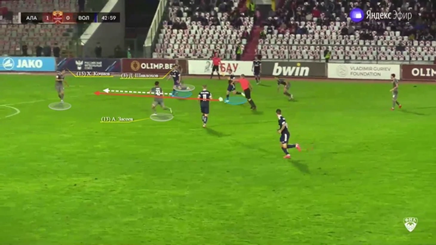 После того как был пройден Хугаев, Засеев вынужден выдвинуться в опорную зону к 11-ому номеру «Волгаря». В это время между двумя центрбеками «Алании» забегает соперник, который и получает передачу. Спасает от пропущенного мяча неточность бьющего.