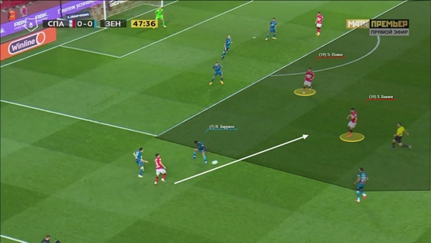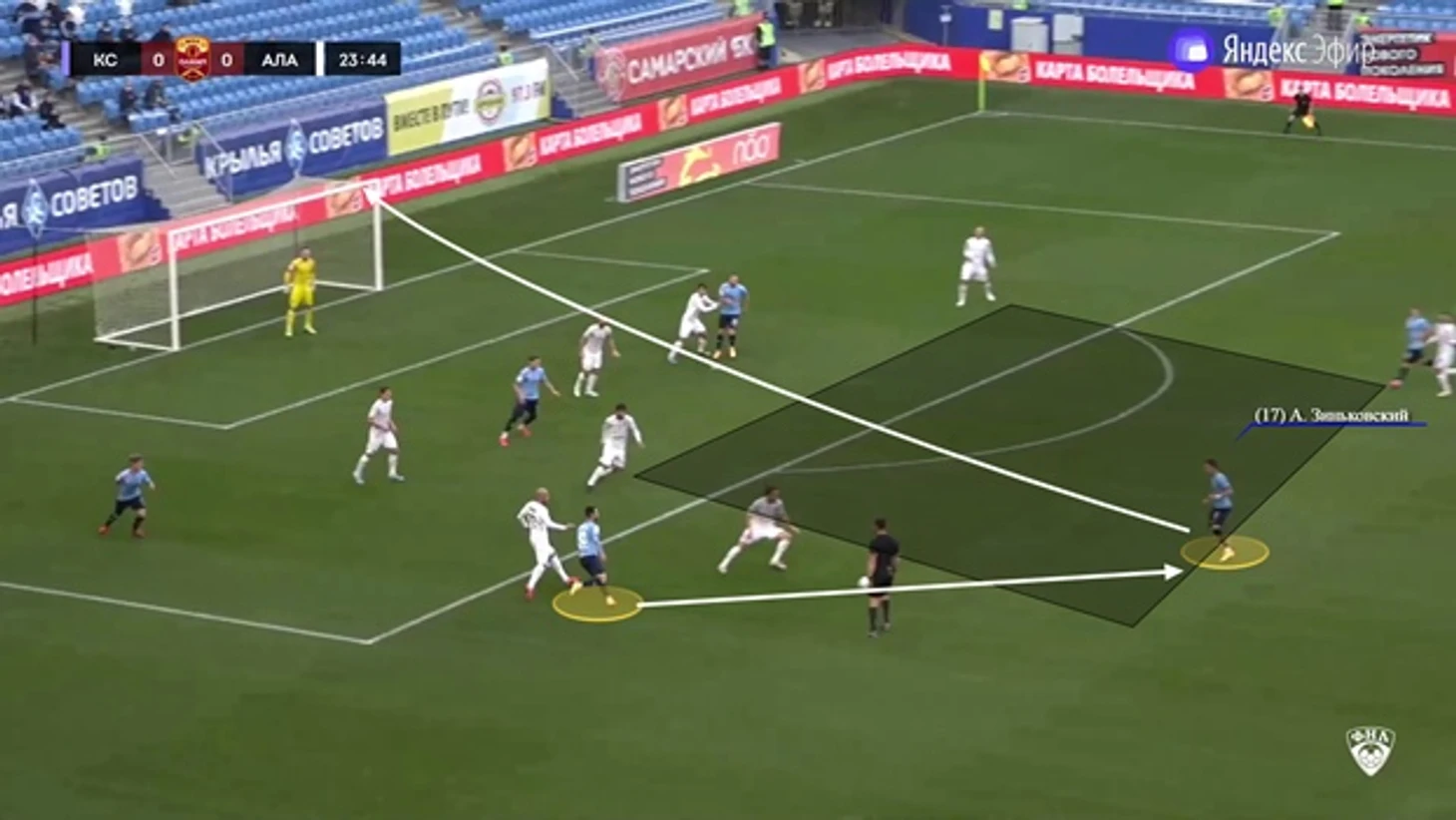В этом эпизоде Журавлев - крайний центральный защитник демонстрирует навык умного паса, который разрезает оборону и практически удается создать опасный момент. Конечно, здесь стоит отметить движение всей команды. Один из футболистов вытаскивает со своей позиции Кочиева, а второй забегает ему за спину. Шавлохов поздно реагирует на это смещение.
