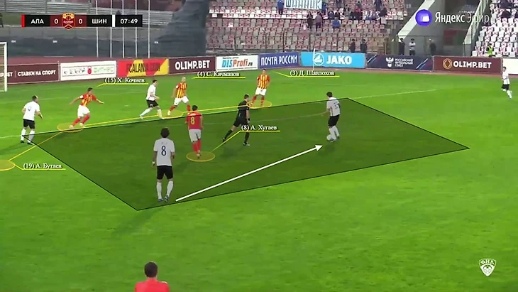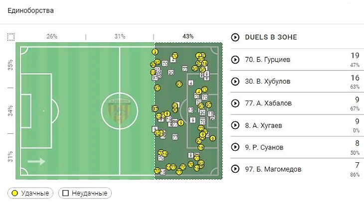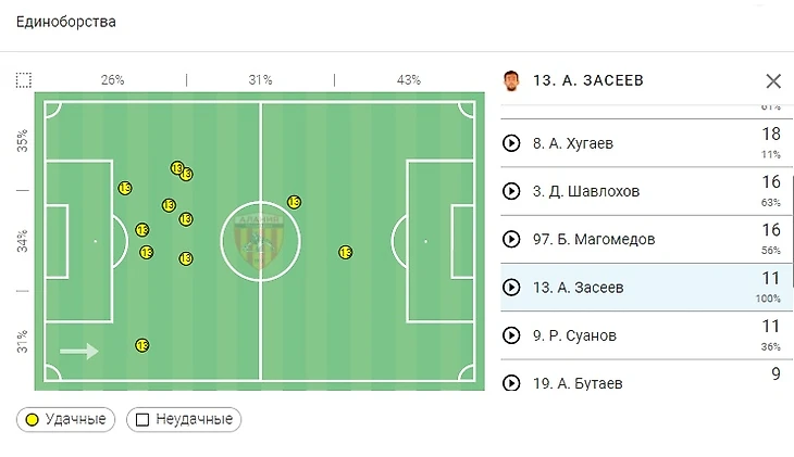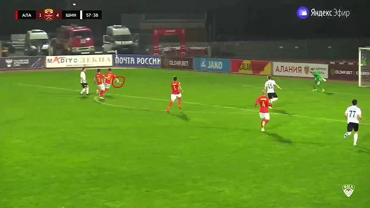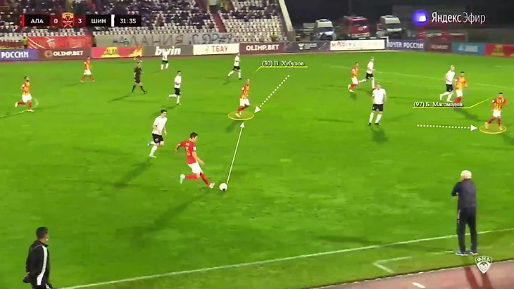Нельзя сказать, что первое перестроение «Алании» перевернуло ход игры в созидательных действиях. Но вот появление Засеева стало для «Шинника» большим разочарованием. Капитан команды выдал 100 процентный показатель выигранных единоборств. Из 11-и дуэлей Азамат не проиграл ни одной борьбы в своей родной опорной зоне (статистика wyscout).