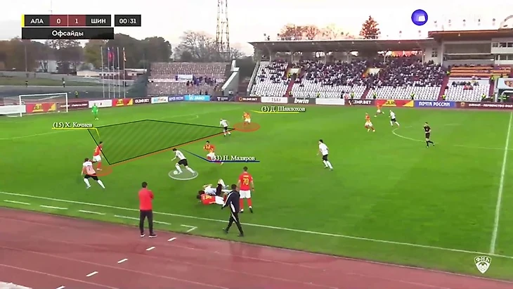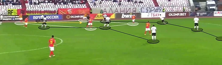 Также важным моментом является действия крайних центрбеков -Кочиева и Шавлохова. От их принятия решений зависит дальнейшее продолжение атак. На стоп-кадре выше, кажется, что атака через левый фланг не имеет перспективы. Однако разворот и обманное движение Шавлохова заставляет соперника перестроиться. В этот момент атака по той же стороне получает «второе дыхание» и некоторую свободу.