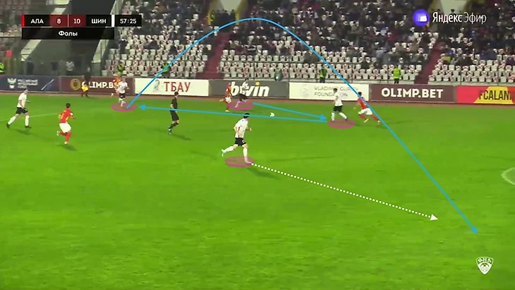 Преодоление обороны «Шинника». Движение мяча и перемещение футболистов «Алании».