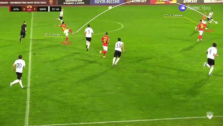 Хабалов забегает за спину защитникам из глубины поля. Хугаев отдает передачу практически не глядя в туже зону: