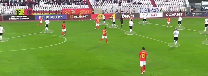 Другой пример со сменой позиций. Ротация между Магомедовым и Хабаловым приводит к тому, что структура в обороне разваливается. Появляются свободные зоны и дополнительные линии передач. В этом аспекте игры «Алания» с каждым матчем прогрессирует. На протяжении всего матча Хубулов регулярно смещался с позиции нападающего.