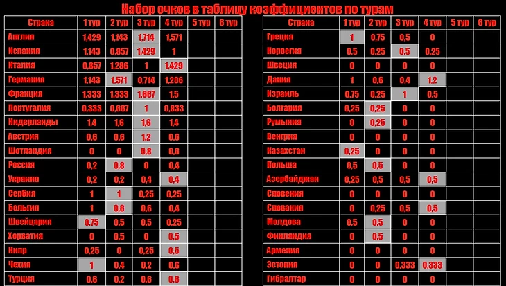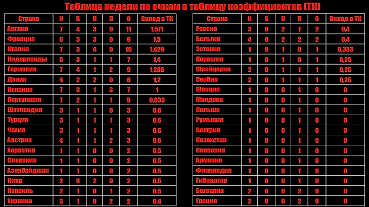 Напоминаем, что везде за победу и ничью даётся 2 и 1 очко соответственно, а количество набранных очков делится на количество заявленных в еврокубки клубов. У стран из топ-4 в строю все 7 команд и их очки делятся на 7 и добавляются в общую копилку. У многих стран осталось по 1 команде при том, что стартовало 4. Это значит, что по итогам тура набрать больше 0,5 никак нельзя. Учитывая эти факторы, мы и будем представлять цифровую картину.