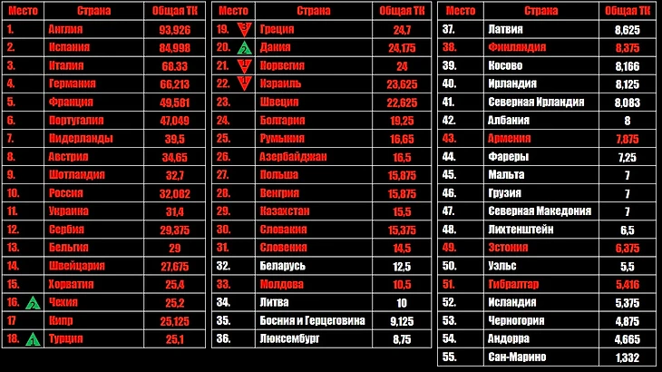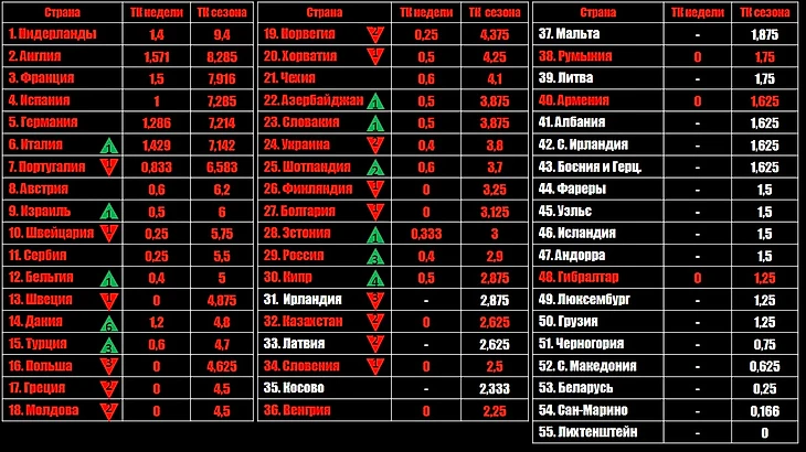 Перед нами уже почти привычная картина. Разве что до сих пор наверху прекрасно проводящие турнир клубы из Нидерландов. «Аякс» уже в плей-офф своего турнира, а АЗ и «Фейеноорд» максимально близки к выходам из групп. Красные и зелёные треугольники указывают на количество потерянных и отыгранных позиций. Мощный рывок совершили датские клубы, которые вот-вот обойдут недавно лидировавших шведов. Ощутимо продвинулась Турция и снова за счёт «Фенербахче» и «Галатасарая». Россияне, наконец, подвинули не участвующих в группах ирландцев и латышей, а вот эстонцев всё никак – «Флора» заслужила свою волевую ничью и ещё проведёт 2 матча, на большее скорее всего не хватит.