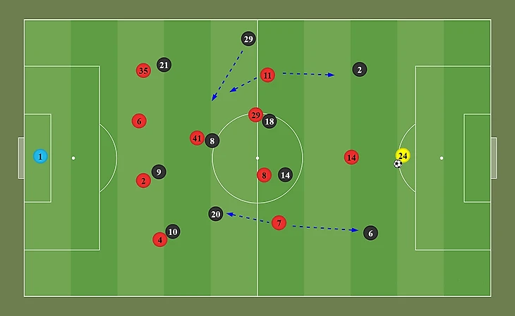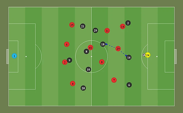 Через голкипера одному из центральных защитников и дальше крайнему защитнику, возвращающемуся в широкую позицию (в основном Уан-Биссака)