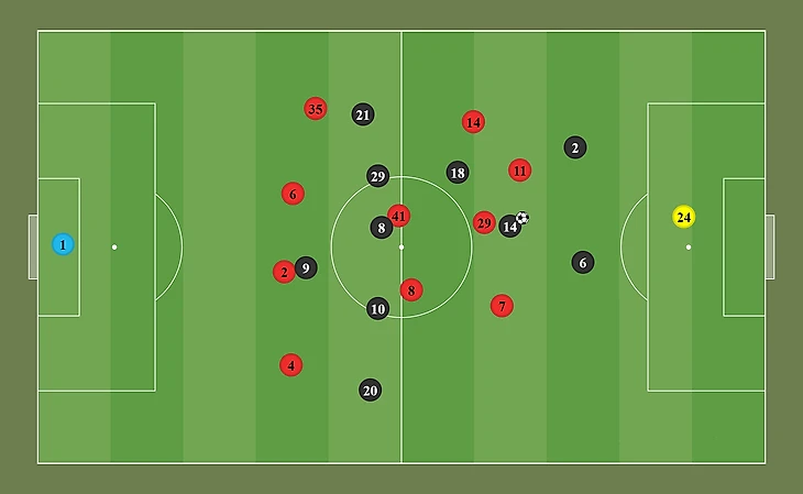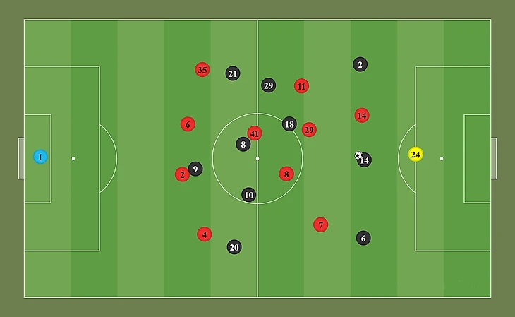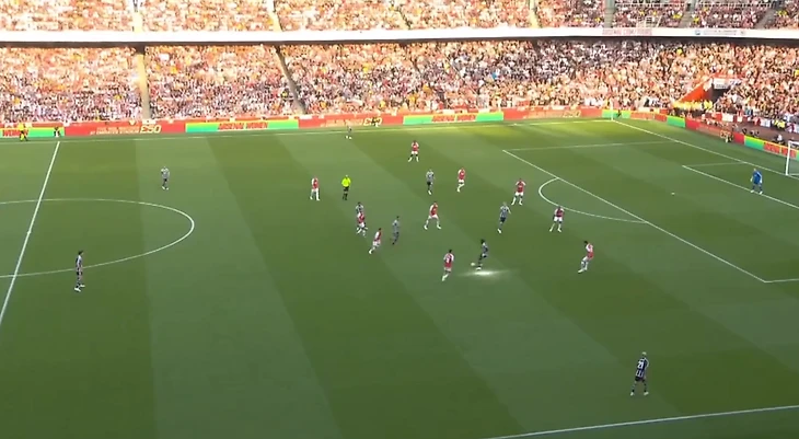 Эриксен получает время и пространство для розыгрыша мяча. В течение матча можно было часто наблюдать, как игроки группы атаки Арсенала рукой указывали партнерам на полузащитников (в некоторых эпизодах это был Каземиро) Юнайтед, распоряжавшихся мячом без какого-либо давления.