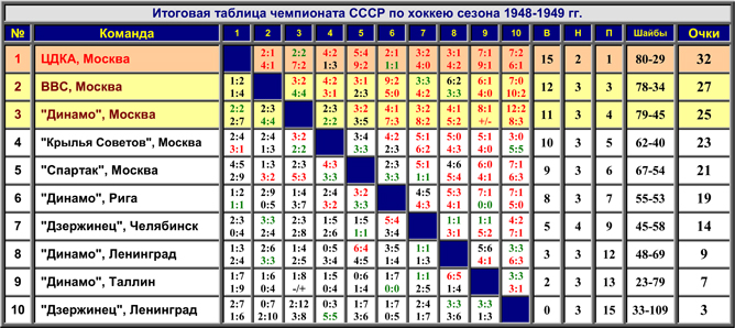 С 12 декабря 1948 года по 26 февраля 1949 года состоялся третий чемпионат СССР по хоккею. Как и во втором чемпионате, 10 команд разыграли звание чемпиона в двухкруговом турнире. Пять первых мест достались московским клубам, а золото снова осталось у ЦДКА, которые в 18 матчах проиграли всего лишь один раз ("Крыльям Советам" 1:3) и дважды сыграли вничью при 15 победах. Впервые в числе призёров оказались лётчики из ЦСК ВВС. Они заняли второе место благодаря успешной игре против своих главных конкурентов - московских динамовцев - 3:2, 4:4 и "Крыльев Советов" - 4:2, 3:1.