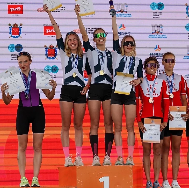 Первая моя победа на первенстве России - это женская эстафета. Нас было 3 человека в составе. Плавание 300 метров, велосипед 8 км и бег 2 км. Через год я победила в смешанной эстафете, где выступают 2 девушки и 2 мужчины. Это олимпийская эстафета. Порядок старта такой: мужчина, девушка, мужчина, девушка. Дистанция такая: плавание 250 метров, велосипед 5 километров, бег 1600 метров.
