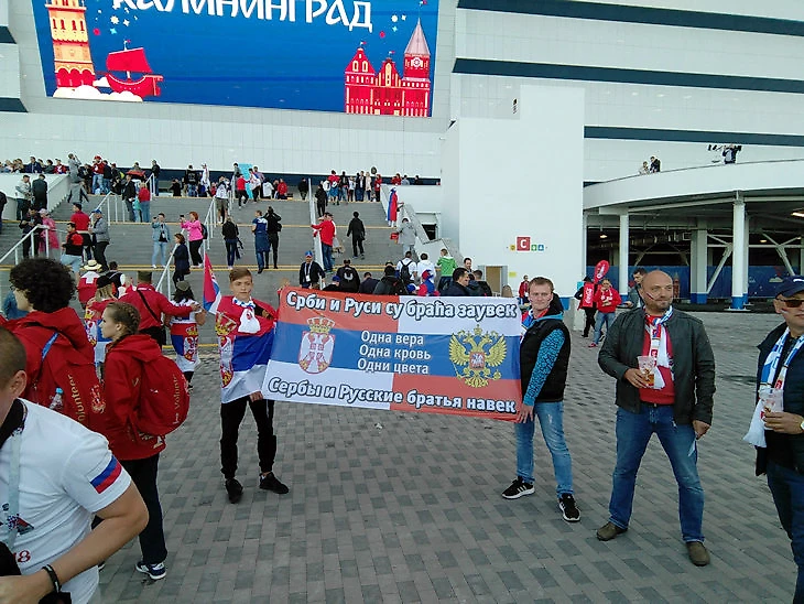 У главного православного собора Христа Спасителя в Калининграде растянули русско-сербский флаг с надписью «Одни цвета – одна вера», а на летней веранде кафе в центре города висел сербский флаг – «Мы русских не бросим». Разумеется, практически все жители Калининграда, захватившие на стадион российский флаг, шли болеть за сербов.