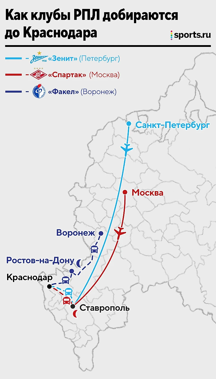 «Спартак» даже переночевал в Ставрополе и провел там предыгровую тренировку. Дорога заняла около восьми часов – по четыре на перелет и на поездку на автобусе. «Зенит» в прошлом сезоне тоже добирался до Краснодара через Ставрополь, но без ночевки. «Факел» не может вылететь из аэропорта своего города, поэтому до Краснодара добирались на двух автобусов – сначала до Ростова (с ночевкой).