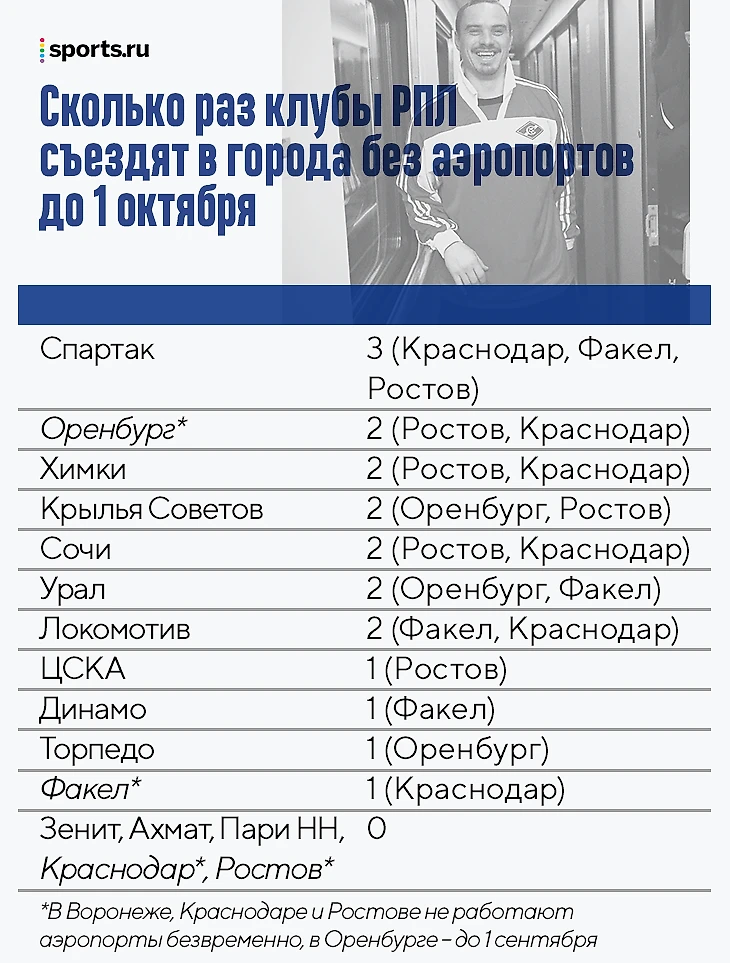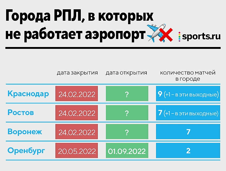 В этом сезоне в РПЛ нет Тулы, зато появились воронежский «Факел» и «Оренбург». В Воронеже аэропорт закрыт с конца февраля, а в Оренбурге ремонтируют взлетно-посадочную полосу.