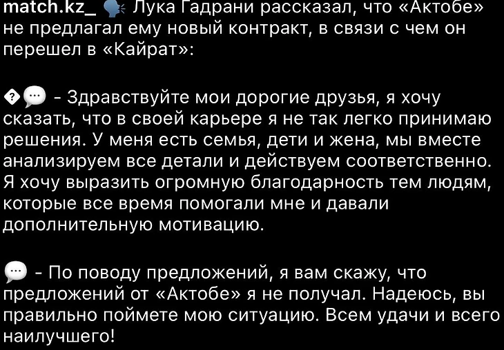 В этой ситуации «желания» не сошлись с «возможностями». Стоит ли критиковать кого-либо решайте сами. Лично у меня к Гадрани никаких претензий нет. Игрок качественно исполнял обязанности на поле, не создавал проблем вне поля. Почему он должен сильно терять в зарплате и ждать новый контракт от «Актобе»? Могу лишь пожелать Луке удачи в карьере.