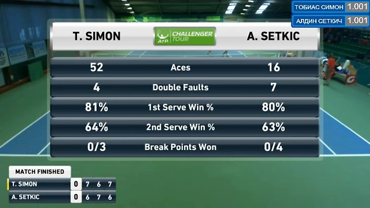 Ни в чем примечательном матче 3 раунда квалификации играли 462 ракетка мира немец Тобиаш Симон и 342 ракетка мира босниец Айдын Сеткич. В матче длившимся 2 часа 20 минут было сделано 68 эйсов и из них 52 сделал немец. Был побит рекорд по эйсам Иво Карловича, который сделал 45 подач навылет против Томаша Бердыха в 2015 году на турнире в Галле (для матчей в 3-сетовом формате). Советую ознакомиться с хайлайтами матча, который войдет в анналы истории.