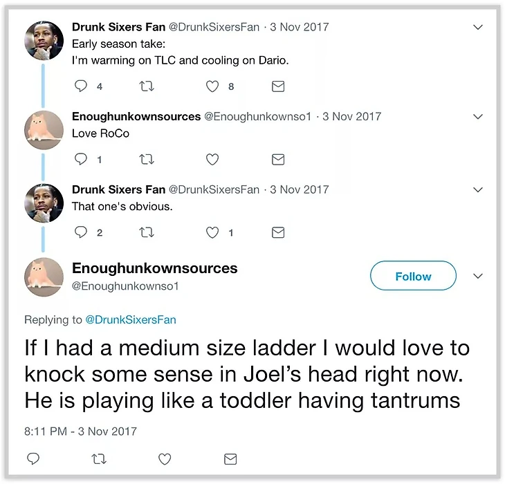 Вопреки позиции Коланджело, аккаунты редко фокусировались на баскетбольной стратегии или статистике, также не выказывая большого интереса в игроках, кроме игроков Сиксерс и суперзвезд. В действительности, другие пользователи Твиттера игнорировали, издевались или высмеивали большую часть постов. Работая над этой историей, я понял, что замьютил Still Balling в прошлом.