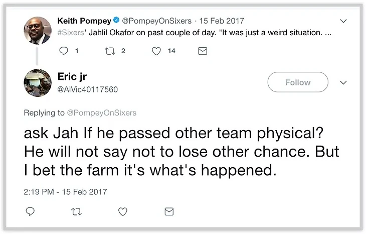 Когда Окафор присоединился к Сиксерс в Бостоне 15 февраля, Коланджело был раскритикован за создание неловкой ситуации для центрового, играющего второй год. С этого момента, Eric jr (и другие аккаунты) постоянно утверждали, десятки раз, что сделка во время дедлайна, включавшая Окафора, была провалена из-за медосмотра. Источник близкий к ожидаемым трейдам сказал мне, что он не был уверен почему переход не состоялся, но необходимые бумаги были подготовлены и «были все причины ожидать, что трейд совершится.»
