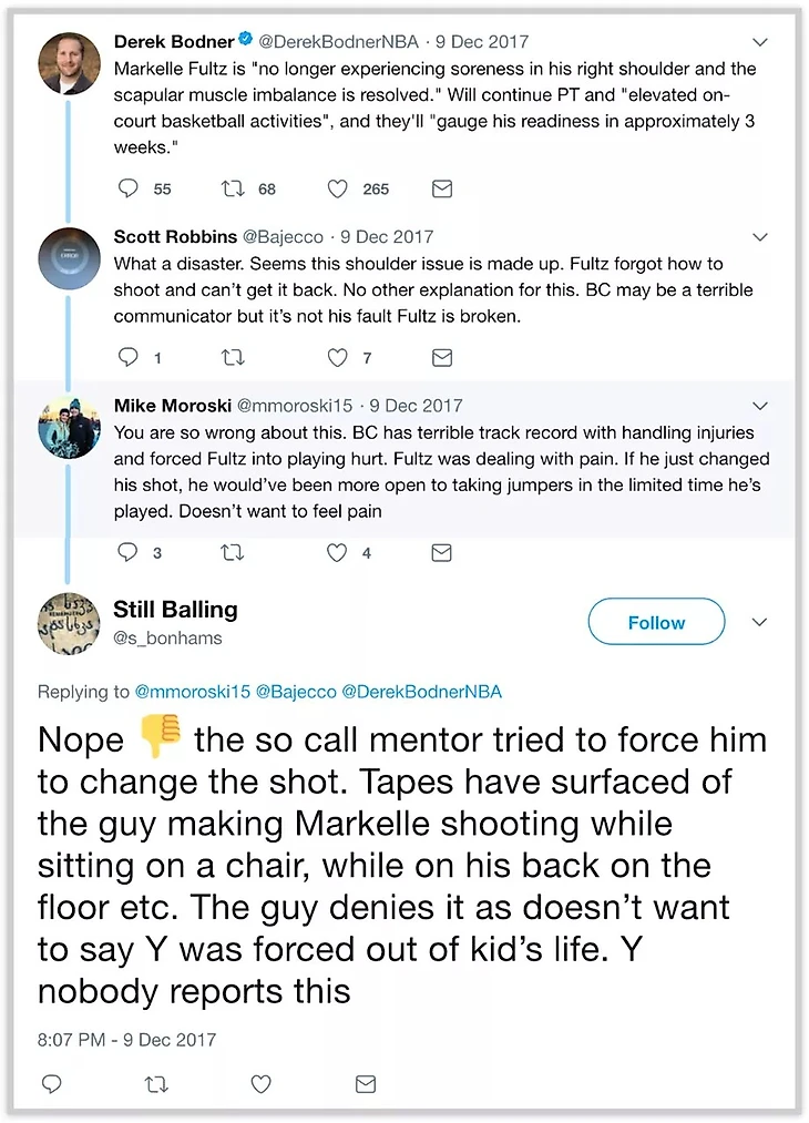 Аккаунты, однако, проповедуют иную историю, которая обвиняет Фультца и Кита Вильямса (Keith Williams), друга семьи и давнего тренера. «Если кто-то озаботится посмотреть на историю того, что случилось с фигурой его так называемого наставника/отца...это объяснит многое о плече и состоянии Фультца», написал Still Balling в обсуждении декабрьского поста от Боднера. «Так называемый наставник пытался заставить его изменить бросок. На всплывших записях парень заставляет Маркелла бросать сидя на стуле, лежа на спине на полу и т.д. Этот парень не хочет говорить почему был выгнан из жизни мальчика. Почему никто не говорит об этом.»