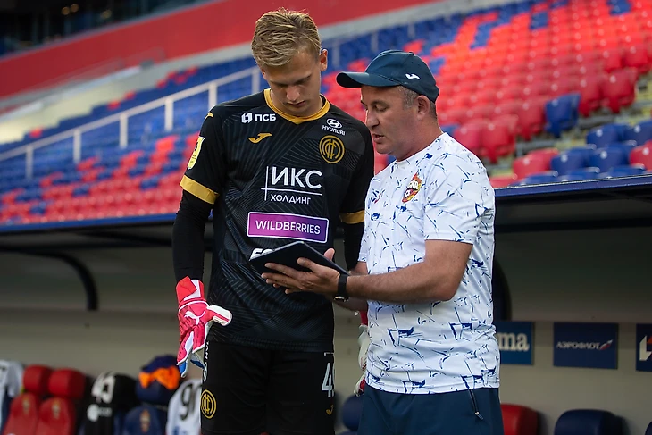Отрабатывали и несколько вариантов выхода из обороны: выносы Акинфеева на Заболотного, чтобы тот цеплялся и скидывал на партнёров, передачи от защитников на Кучаева, располагавшегося ближе к линии обороны, и игра через фланги.