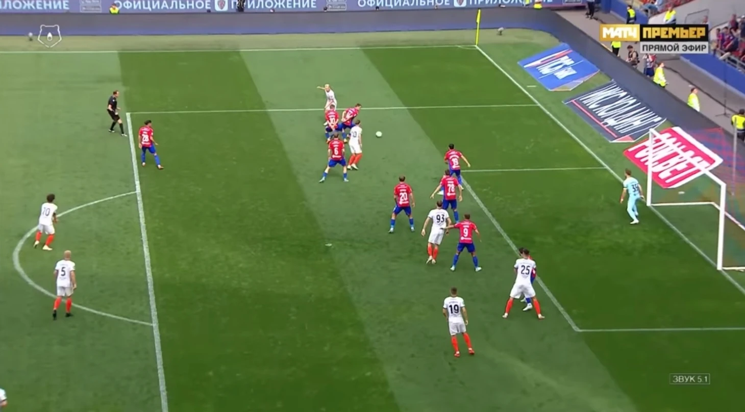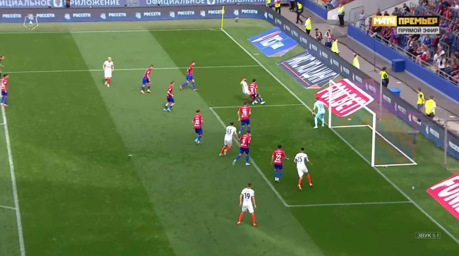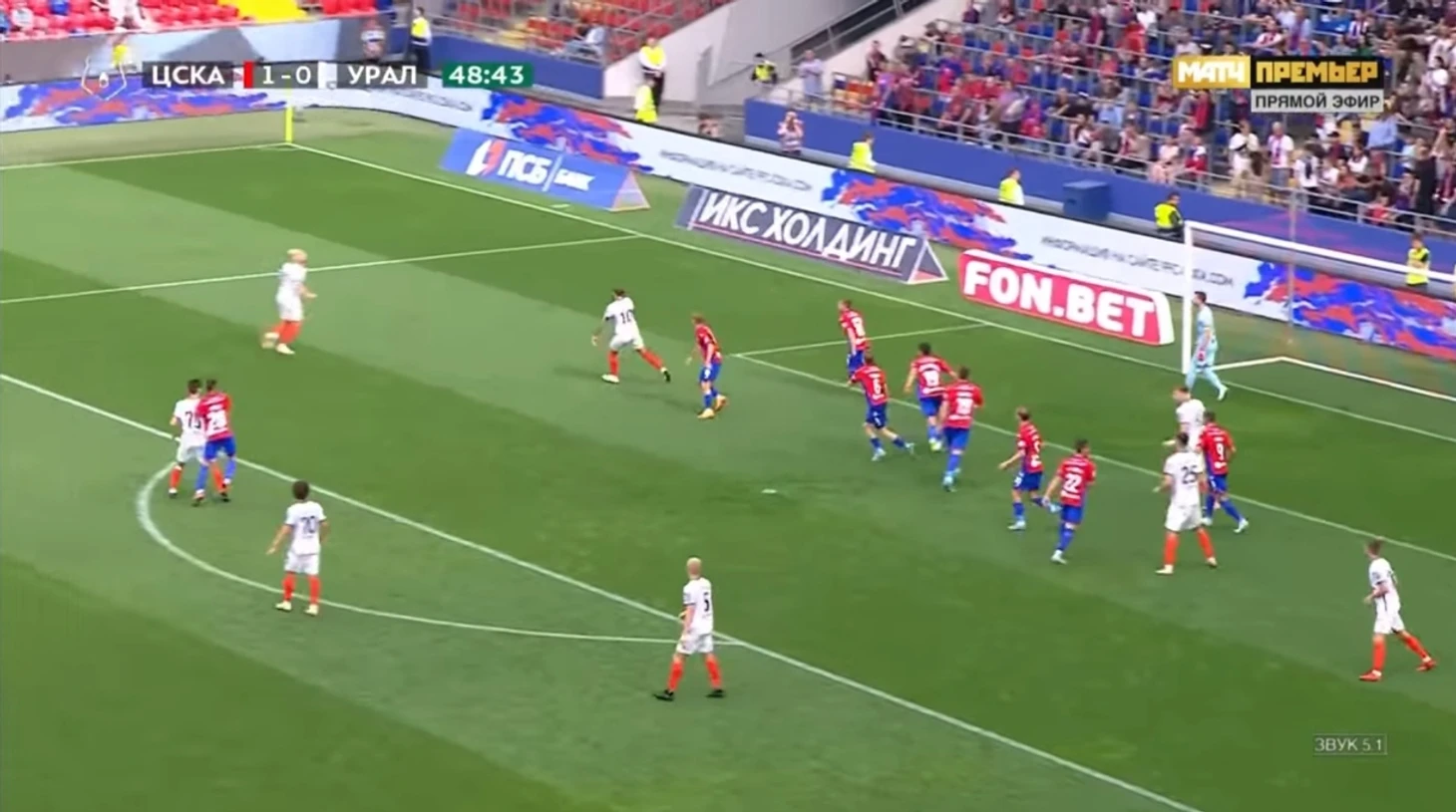 Повезло, что футболист Урала не смог замкнуть этот прострел. А про серба хочу добавить, что по первым матчам за ЦСКА заметно, что он довольно плохо сканирует пространство при игре в обороне, из-за чего упускает соперников, располагающихся сзади него.
