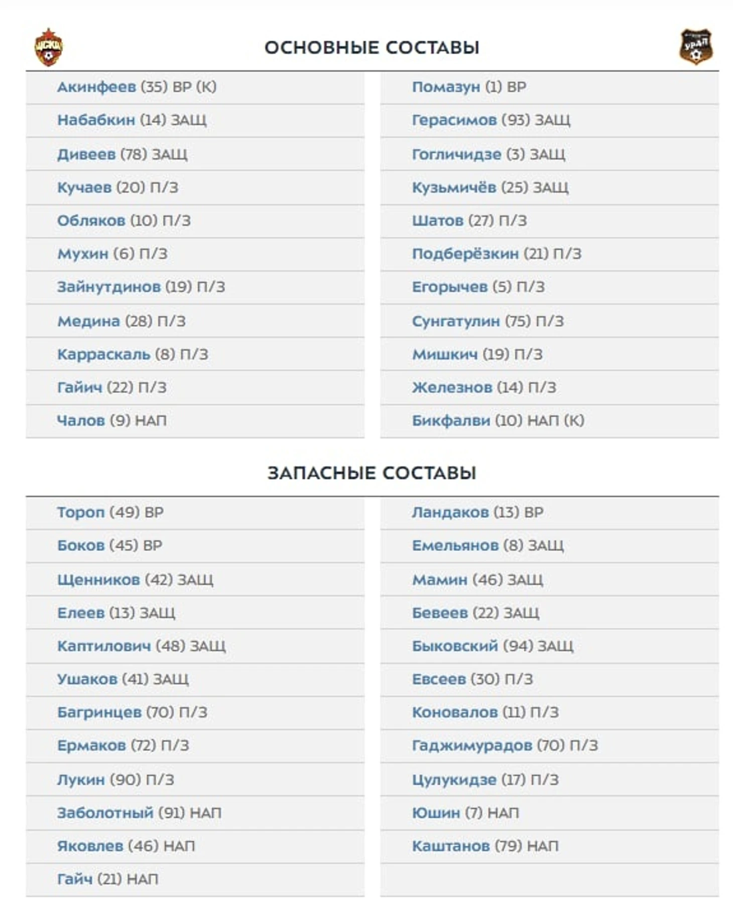 В стартовом составе обошлось без сюрпризов: Акинфеев, тройка защитников Зайнутдинов-Дивеев-Набабкин, латерали Обляков и Гайич, пара в центре поля Кучаев-Мухин, латиноамериканские инсайды Карраскаль и Медина, а нападающий Чалов.