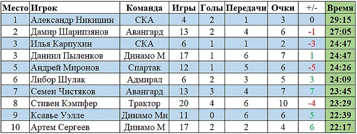 Вторым стал Дамир Шарипзянов, который в среднем проводил 27:05. Третье место поделили Илья Карпухин («СКА») и Даниил Пыленков («Динамо» Москва), они в среднем проводили 24:47 на льду.