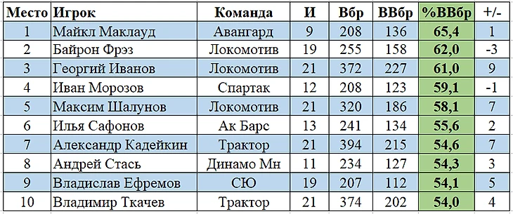 Как видно по проценту выигранных вбрасываний в первой пятерке находится 3 игрока «Локомотива», ярославцы доминировали на точке как в регулярном сезоне, так и в плей-офф. Это стало очень важным фактором для них на пути к чемпионству.