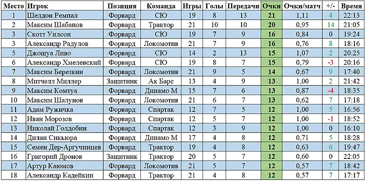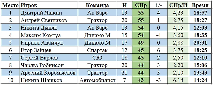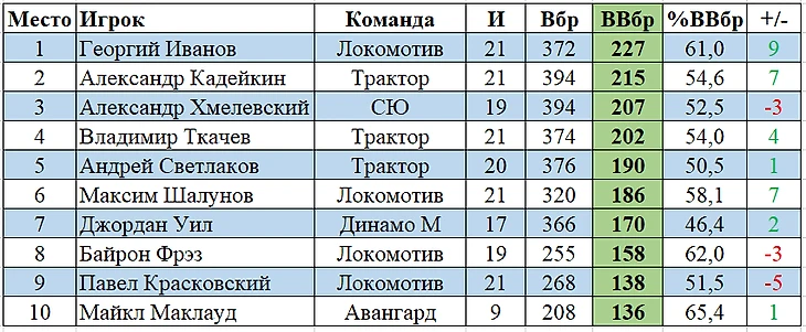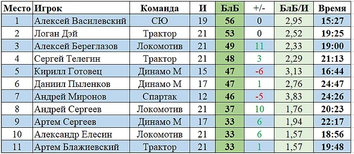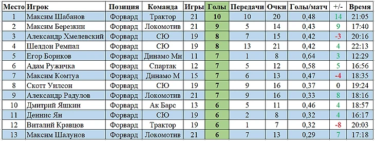 Лучшим по показателю полезности стал Максим Шабанов, у которого «+14» за 21 матч. Дальше идет 6 (!) игроков «Локомотива», среди которых лидерами являются 2 защитника Алексей Береглазов (+11) и Андрей Сергеев (+10).