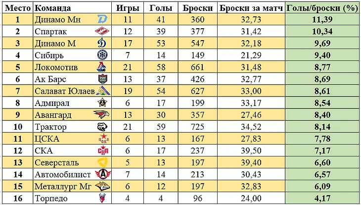 Наименьшее количество бросков в среднем за матч у «Сибири» – всего 21.29. Еще у трех команд в среднем менее 30 бросков за матч: «Торпедо» (24.00), «Авангард» (27.46) и «ЦСКА» (27.83).