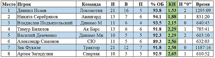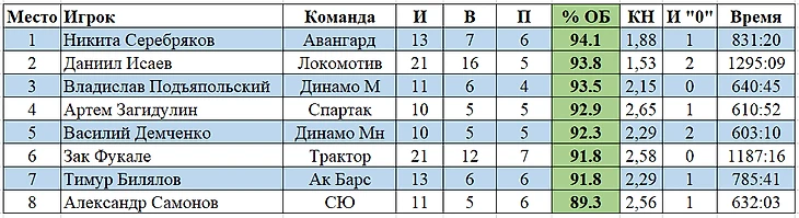 По проценту отраженных бросков лучшим вратарем Кубка Гагарина стал Никита Серебряков с отличным показателем – 94.1 %. Второе место у чемпиона Даниила Исаева – 93.8%. Третьим стал вратарь московского «Динамо» Владислав Подъяпольский – 93.5%. Отмечу, что в таблице представлены вратари, которые сыграли минимум 10 матчей в плей-офф.