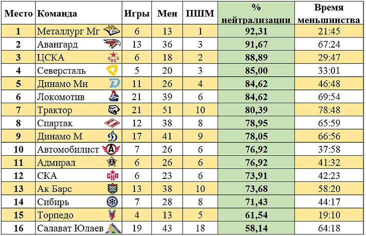 Худшими по нейтрализации большинства стали игроки «Салавата Юлаева», уфимская команда пропустила 18 голов на 43 попытки (58.14 %).