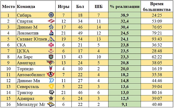 По абсолютным показателям лучшими стали игроки московского «Динамо», они забросили 14 шайб в большинстве. Далее расположились «Салават Юлаев» (13 шайб), «Локомотив» (12), «Спартак» (11) и «Ак Барс» (10).