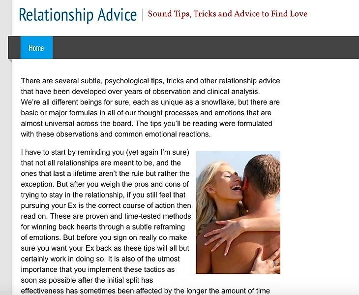 В анкете написано, что Абду работает на сайте Albaladcomores.com. Открываем – сайт состоит из одной странички с текстом о том, как вернуть бывшего. Автор не указан.