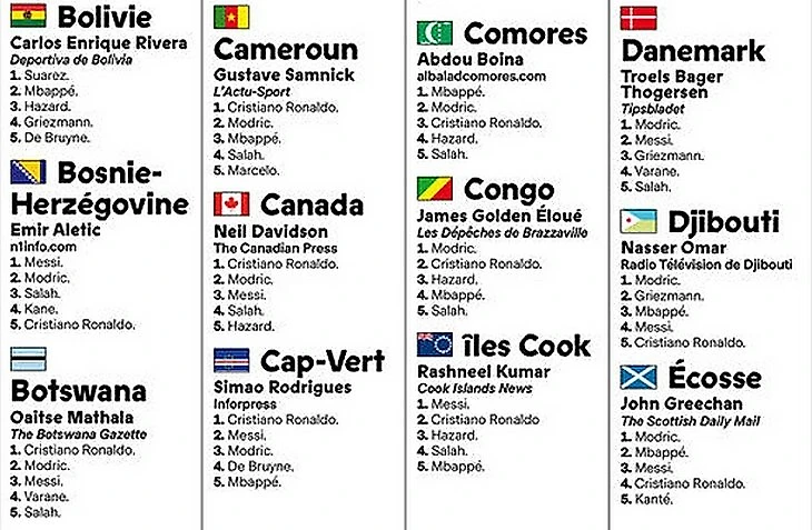 • Но самое интересное в этом списке – журналист из Коморских островов (государство в Индийском океане) Абду Бойна, который расставил игроков так: Мбаппе, Модрич, Роналду, Азар и Салах.
