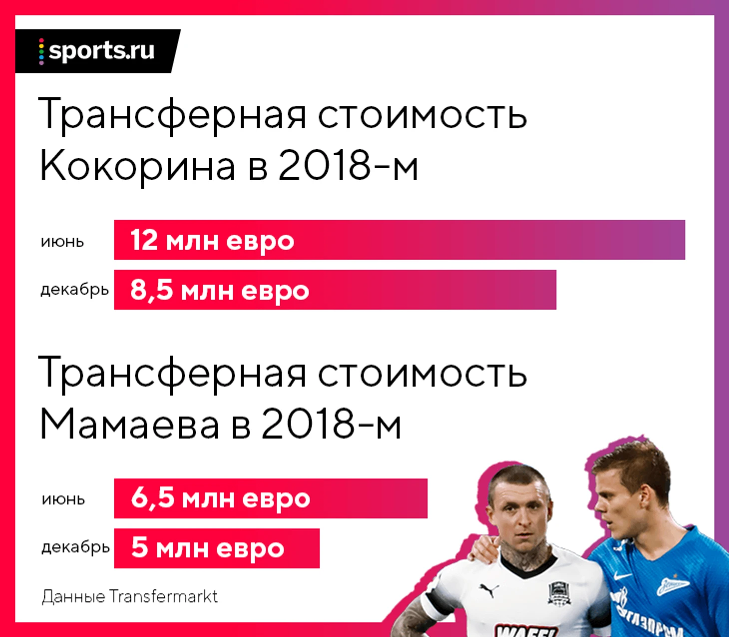 • Мамаев подешевел не так значительно, потому что мощно стартовал: «Мамаев отлично начал сезон (3 гола + 3 голевых в 13 матчах – Sports.ru), потому понижение его цены меньше, чем Кокорина, который из-за травмы уже пропустил до этого полгода. Игрок «Краснодара» потерял, грубо говоря, 500 тысяч в месяц, а Кокорин – на миллион больше.