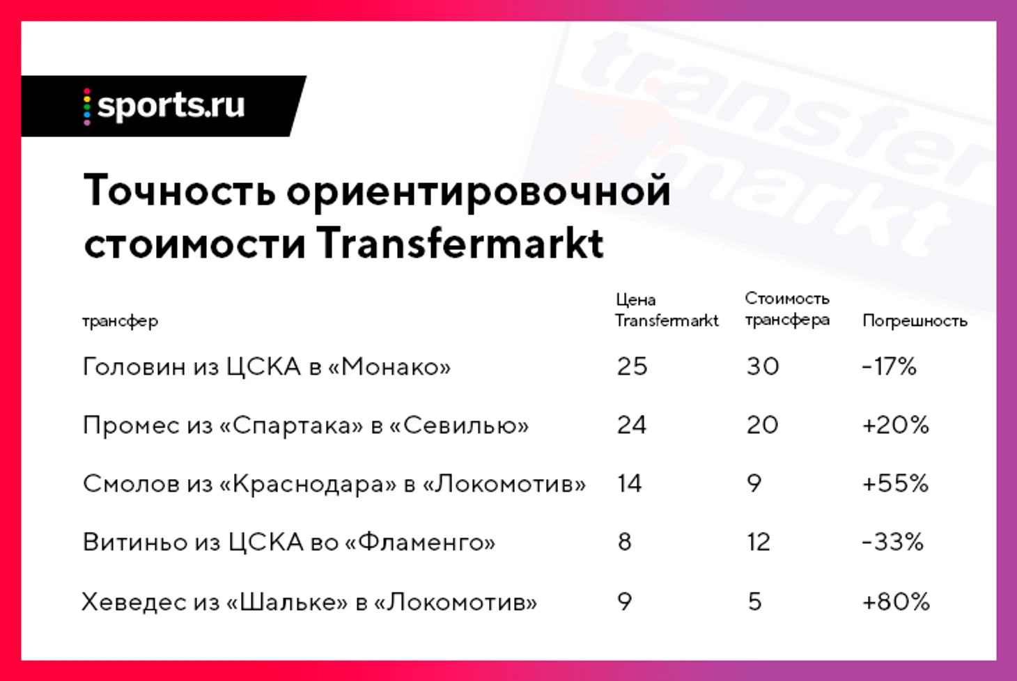 Знаем, что Transfermarkt просит этого не делать, но единственный способ оценить точность данных – сравнить ориентировочную цену игрока с реальной стоимостью его трансфера. Когда речь не о свободных агентах и не о футболистах с истекающими сроками контракта, это вполне объективный критерий. Ниже – пять топовых российских трансферов этого сезона (аренды не учитываются).