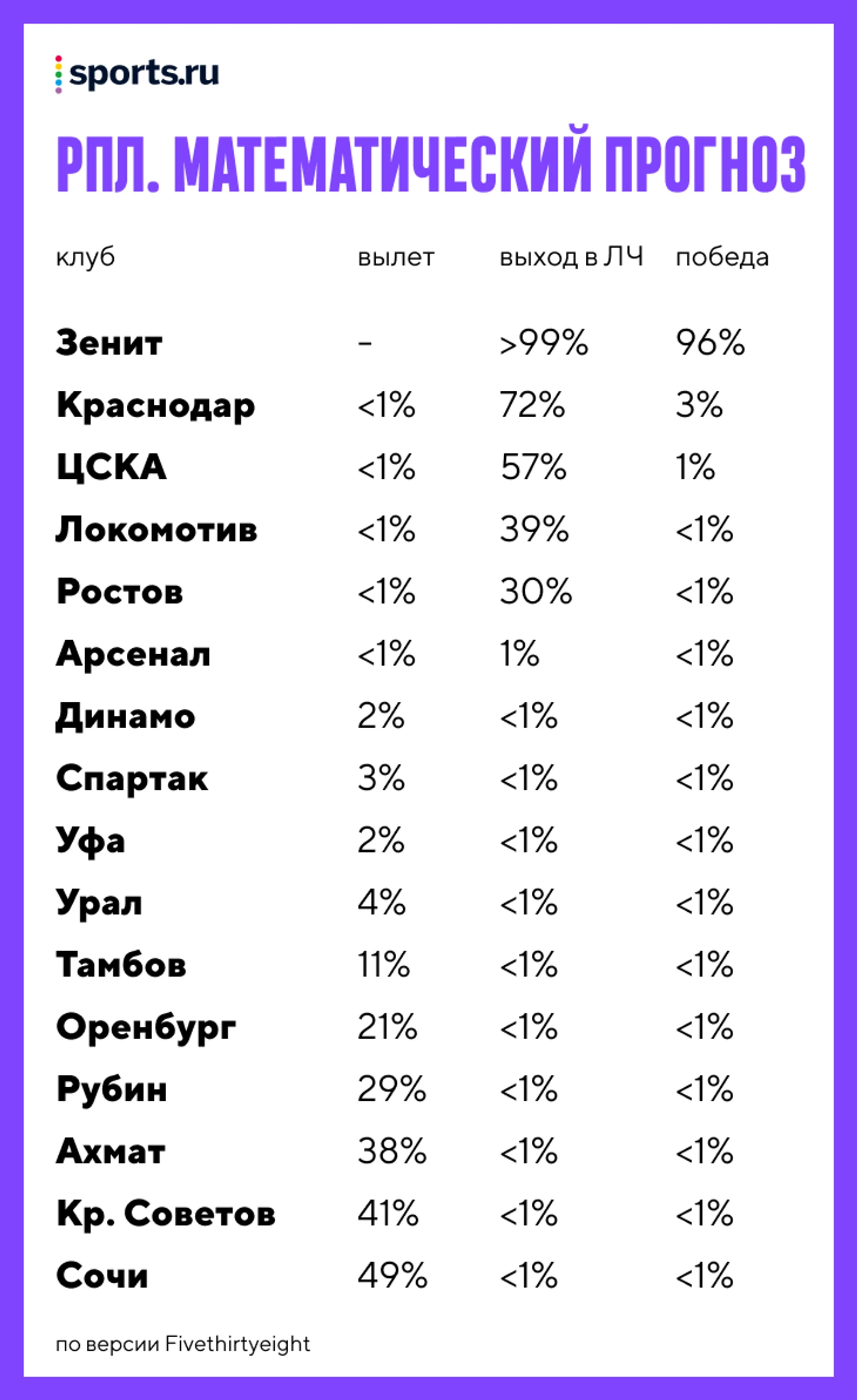 Вот таблица вероятностей чемпионата России