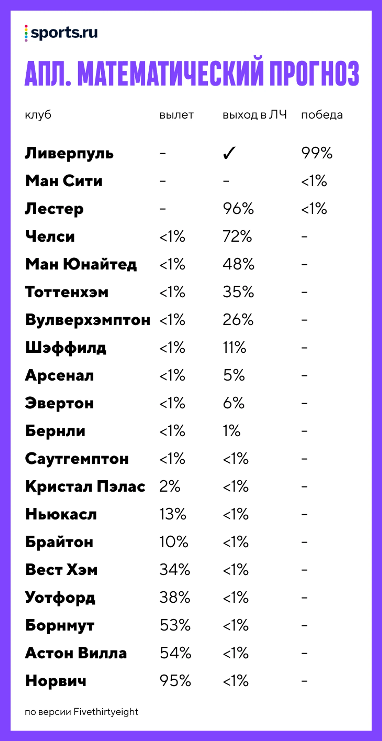 Кратко: FiveThirtyEight присваивает каждой команде собственный рейтинг – на его основе высчитывается вероятность результата каждого матча. Далее – 20 тысяч симуляций всех игр сезона, а на выходе итоговая таблица с шансами команды на чемпионство, попадание в ЛЧ и вылет.