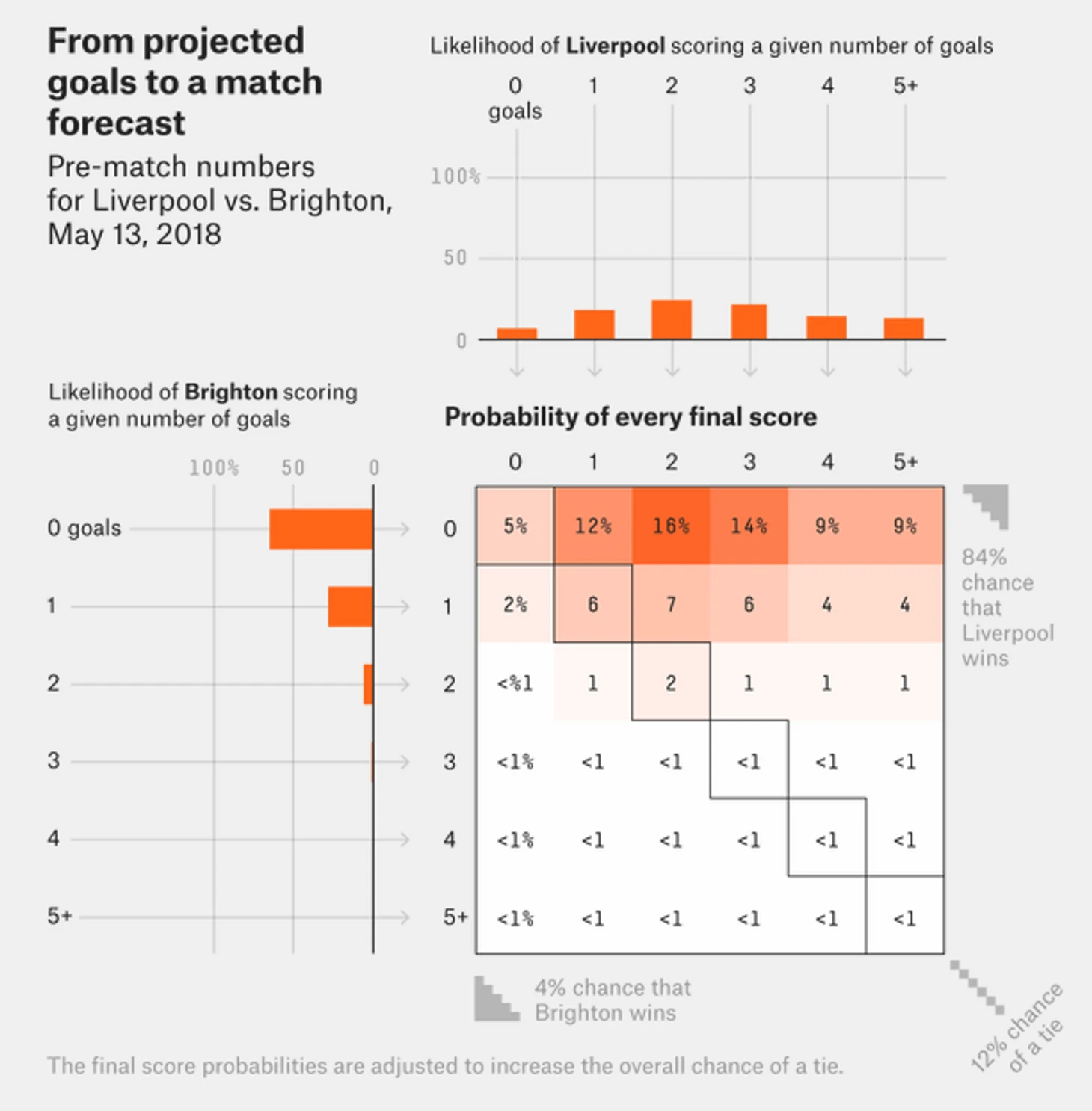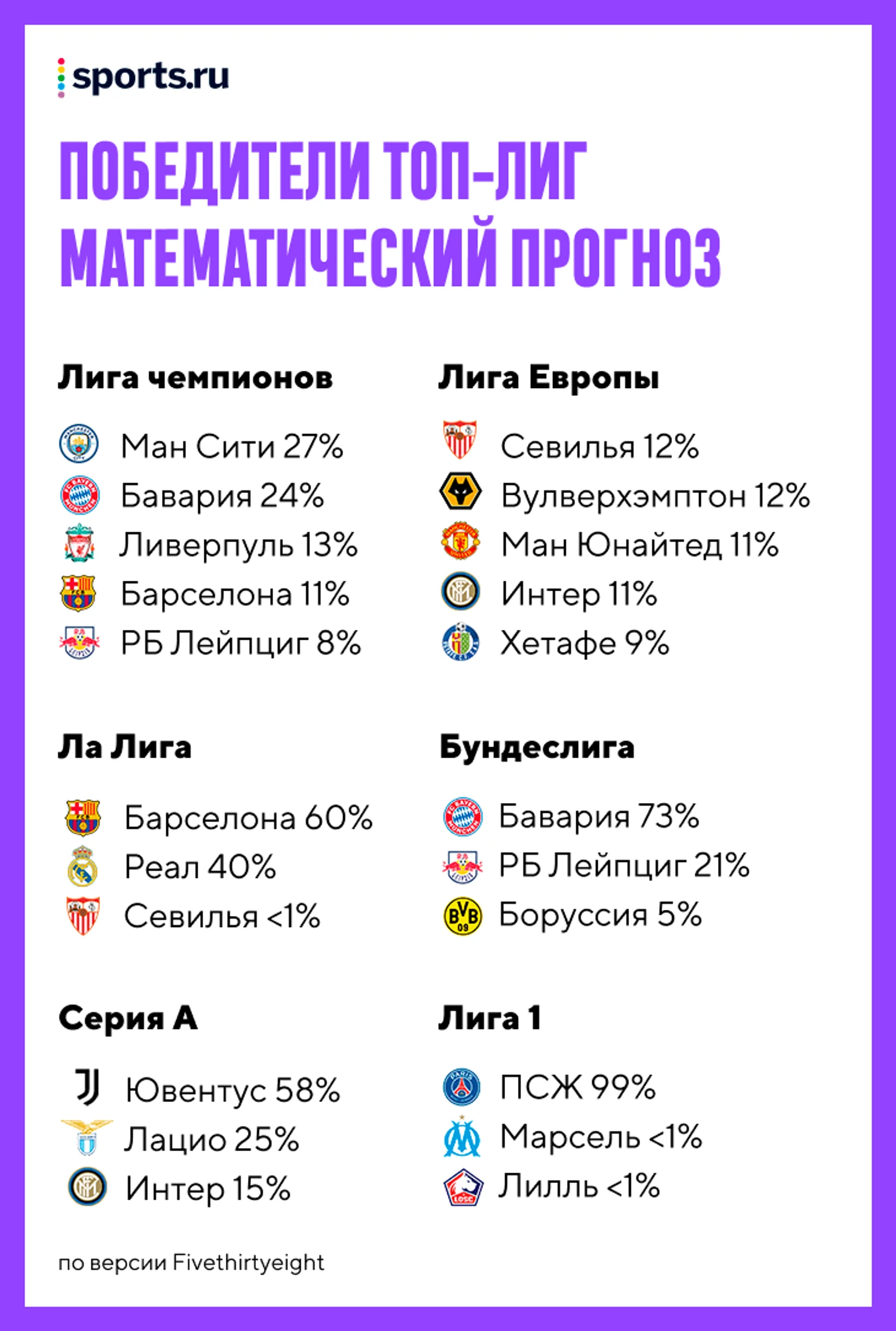 Сейчас FiveThirtyEight входит в систему АВС News (как и ESPN, принадлежит The Walt Disney Company) и каждый месяц собирает по 20 млн уникальных пользователей. В январе 2017-го они запустили постоянно обновляемый прогноз на топовые лиги, а с августа 2018-го расширились до 35 лиг. Теперь математическая модель считает даже РПЛ.