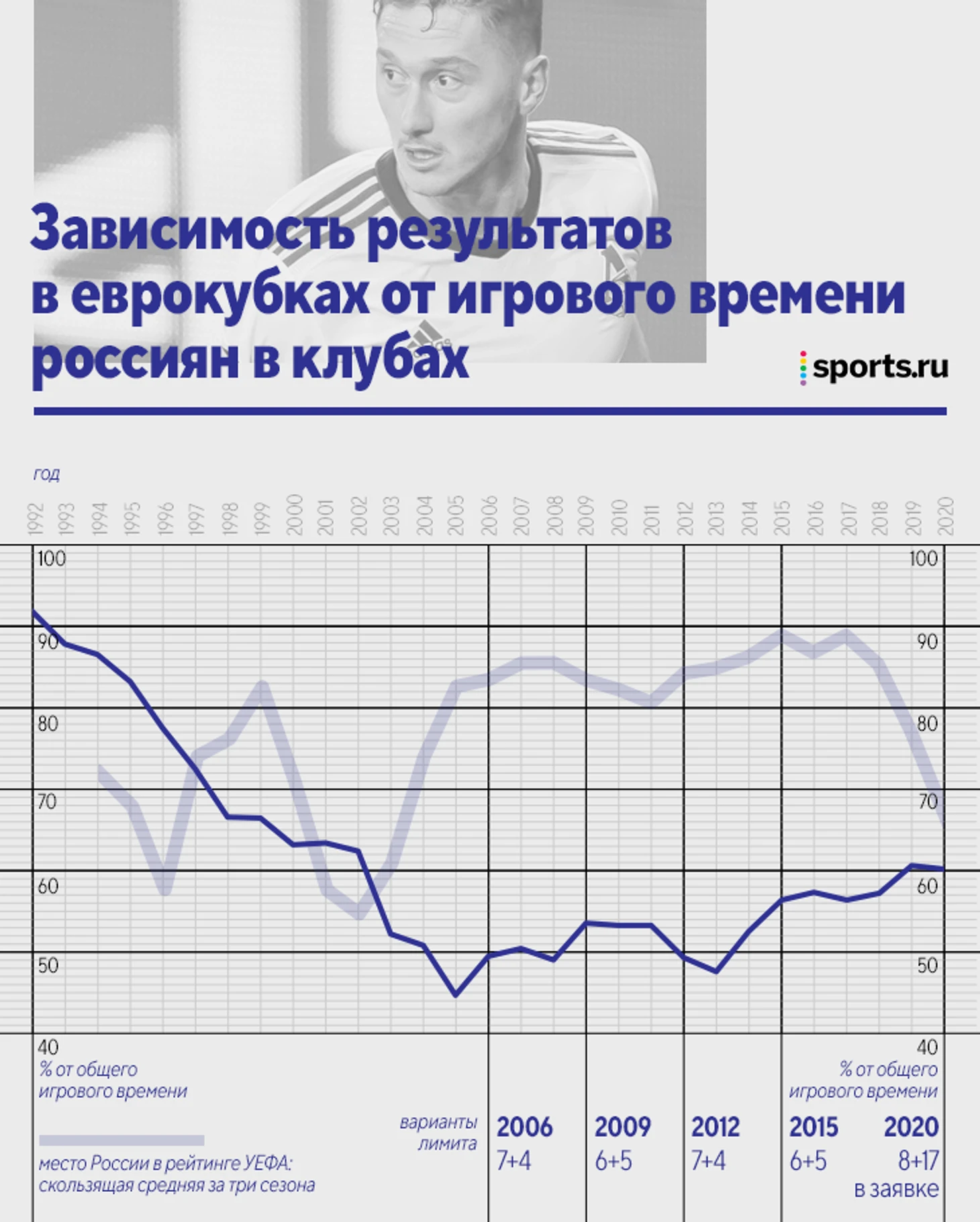 Спад результатов, возможно, коррелирует с ростом вовлечения российских футболистов – чем больше у них игрового времени, тем хуже результат в еврокубках. И здесь можно поискать косвенное влияние лимита.