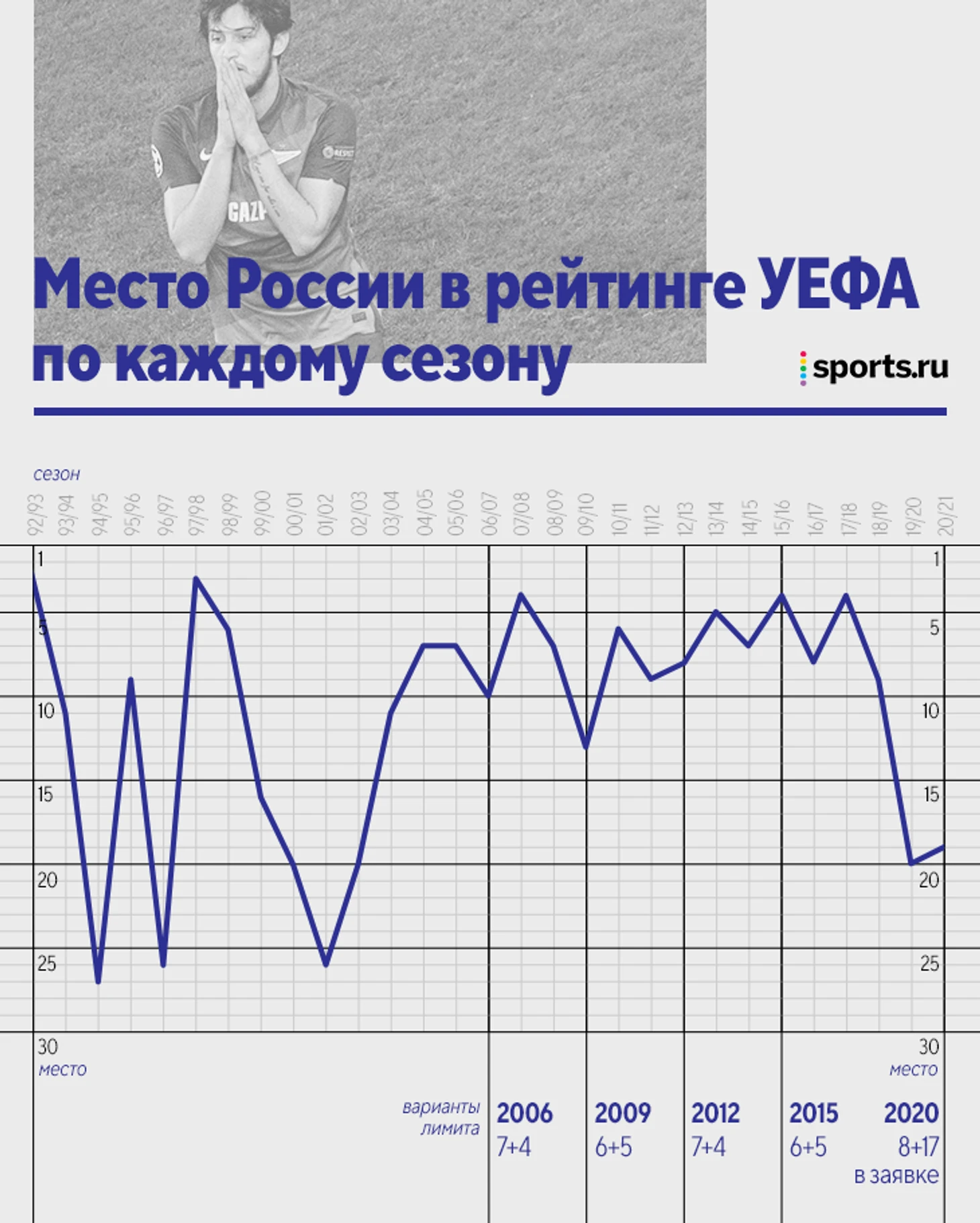 90-е и начало нулевых – хаос, но после победы ЦСКА в Кубке УЕФА в 2005-м результаты надолго стабилизировались на относительно высоком уровне (без провалов в двадцатку). Прямой зависимости от лимита нет, но это в целом это объяснимо – ведь в еврокубках нет ограничений на иностранцев.